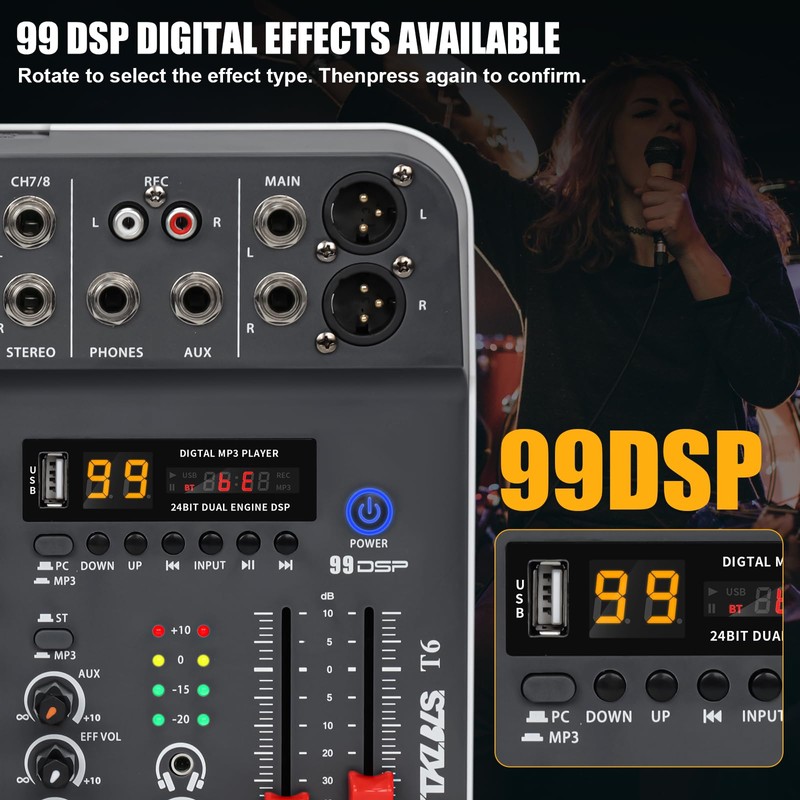 • 【Precision Sound Shaping】Shape your audio output with independent high and low EQ controls on each channel, making real-time tone adjustments easy and effective. The built-in digital delay processor adds dimension and depth to vocals or instruments—perfect for enhancing live sound, creating atmosphere in karaoke sessions, or adding subtle spatial effects during livestreams