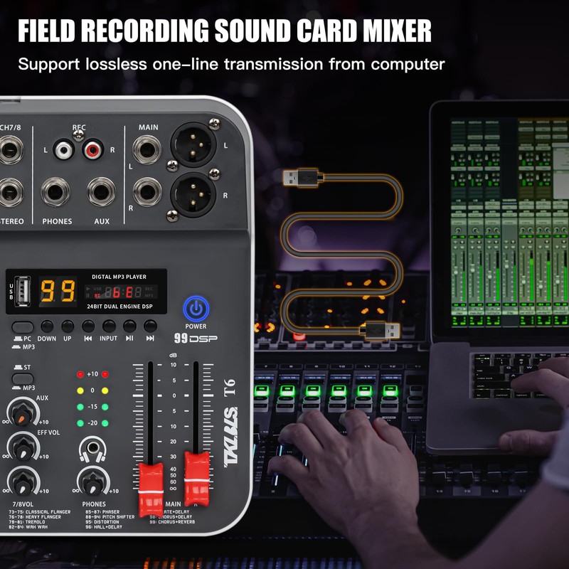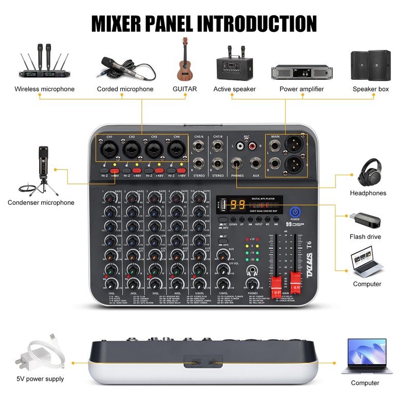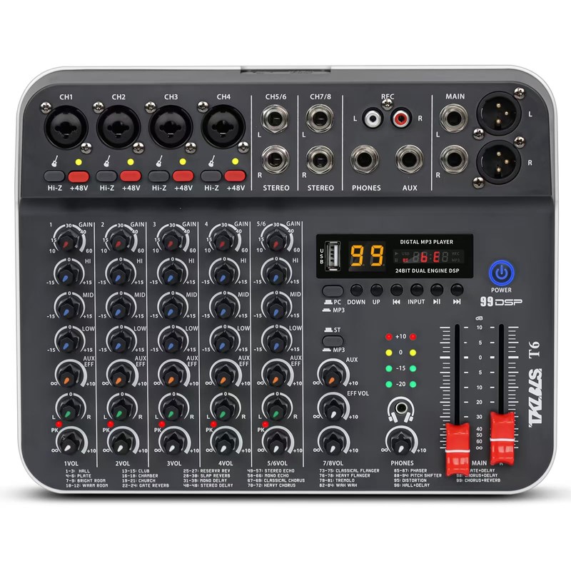 • 【6-Channel Input】Easily manage up to 6 separate input sources simultaneously, including microphones, instruments, and media players. Each channel features independent GAIN and EQ knobs for fine-tuned control, while dedicated left/right sliding faders allow intuitive and accurate volume balancing during live performances or streaming sessions