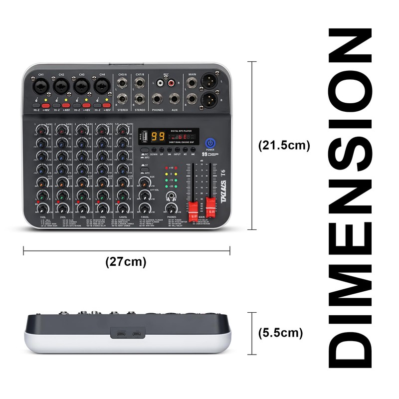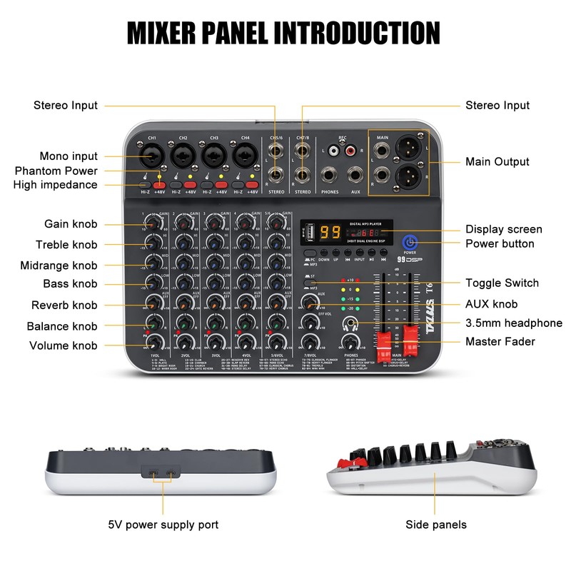 • 【XLR & LINE Combo Jacks with +48V Phantom Power】This audio mixer supports both XLR and 1/4" LINE inputs via versatile combo jacks, offering maximum compatibility with dynamic mics, instruments, or condenser microphones. Activate the built-in +48V phantom power with a simple switch to unlock full potential for studio-quality sound in professional recording, podcasting, or live vocal applications