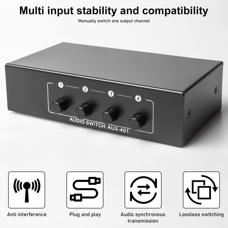 - 4 INPUTS 1 OUTPUT AUDIO SPLITTER Connect audio source devices to a single output simultaneously to achieve seamless connection of multiple devices and achieve more realistic live sound effects