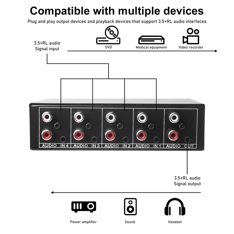 - Compatible with multiple devices: the audio switcher supports 3.5+RL audio interface output devices and playback devices, suitable for various medical devices, DVDs, video recorders, etc