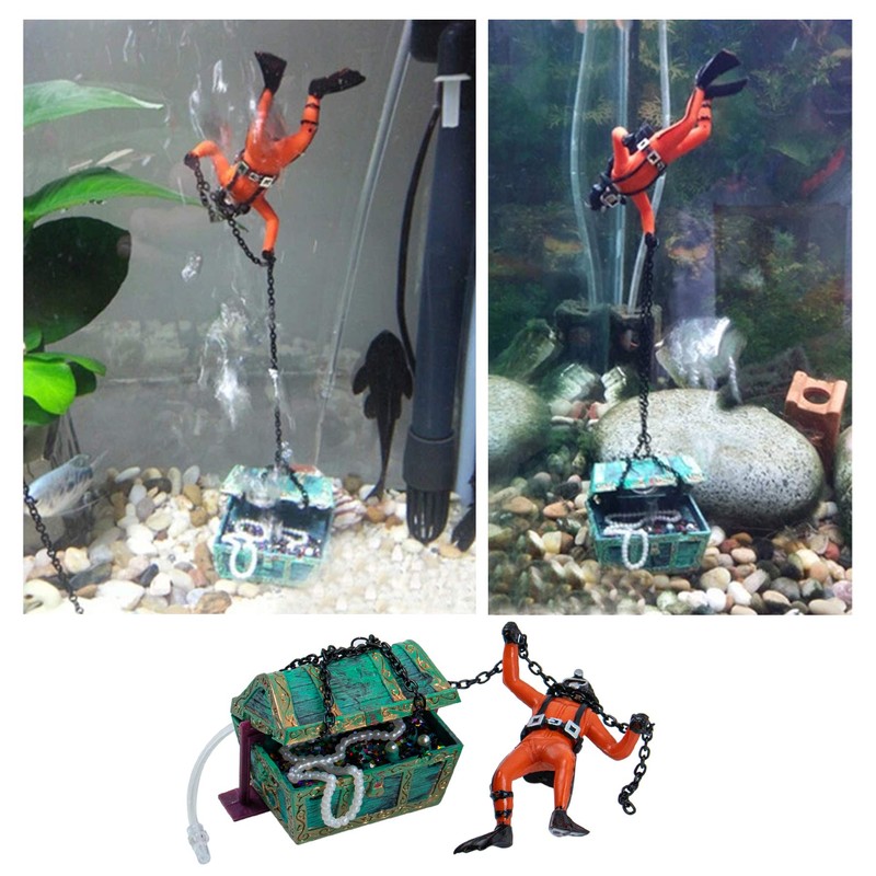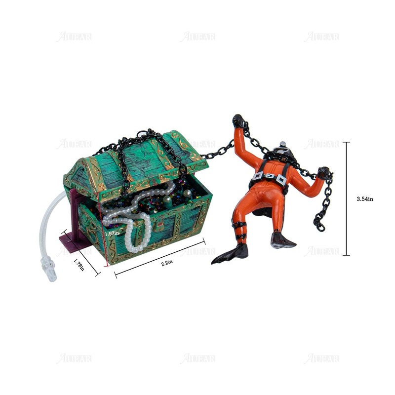 AUEAR, Moving Treasure Chest Diver Action Figure Decoration for Aerating Aquarium Fish Tank Ornament