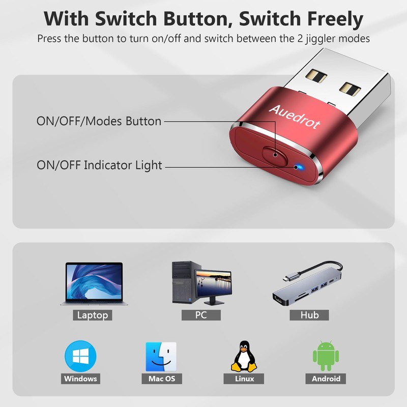 - METAL MATERIAL WITH SWITCH BUTTON: This mouse jiggler is made of aluminum alloy, which is more upscale and sturdy than plastic. With ON/OFF/Modes Switch button, "Short Press" to turn on/switch between the 2 modes, and "Long Press" to turn it off