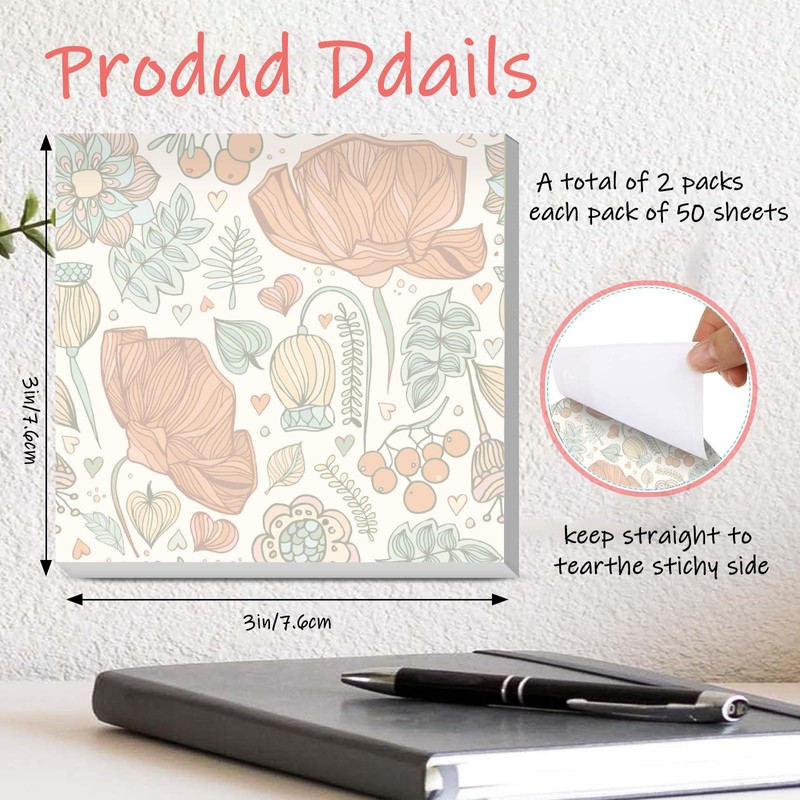 AUEKLLW Sticky Notes 3x3 Inches, 2 Pads Cute Colorful Self-Stick Note Pads, Easy to Post for Home, Office and Daily Life Organization Boho Floral