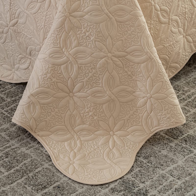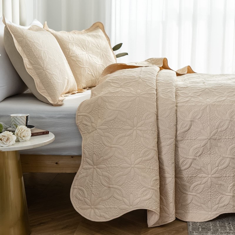 Auemtyn King Size Quilt Set 3 Pieces, Soft Lightweight Summer Bedspread, Reversible Microfiber Bed Coverlet for All Seasons, Beige, Floral Pattern (1 Quilt, 2 Pillow Shams)