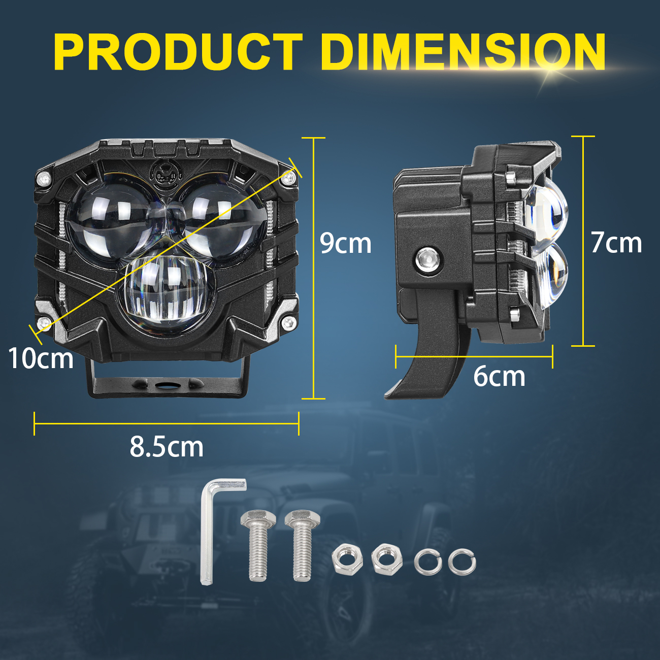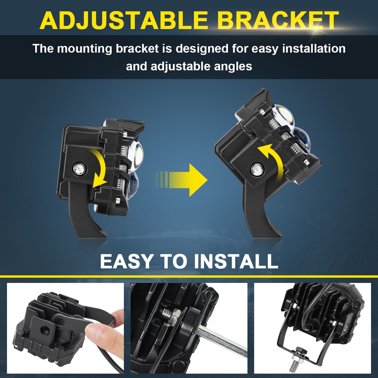 ►Flexible bracket adjustment: U-shaped aluminum alloy bracket, rust resistant and corrosion-resistant, can freely adjust the angle of the spotlight, making it easy to install in the fog lamp hole, bumper, A-pillar or roof of the vehicle.