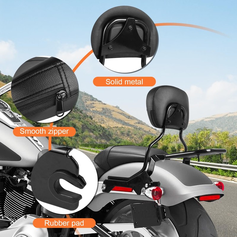 - ▲1.The backrest sissy bar and the rear luggage rack is made of good quality heavy duty metal,black finish promise no scratch on surface.And the backrest cushion pad is made of high quality PU leather,built in with soft sponge,wear resistant,dirt resistant,breathable and comfortable.And easy to disassemble and clean.