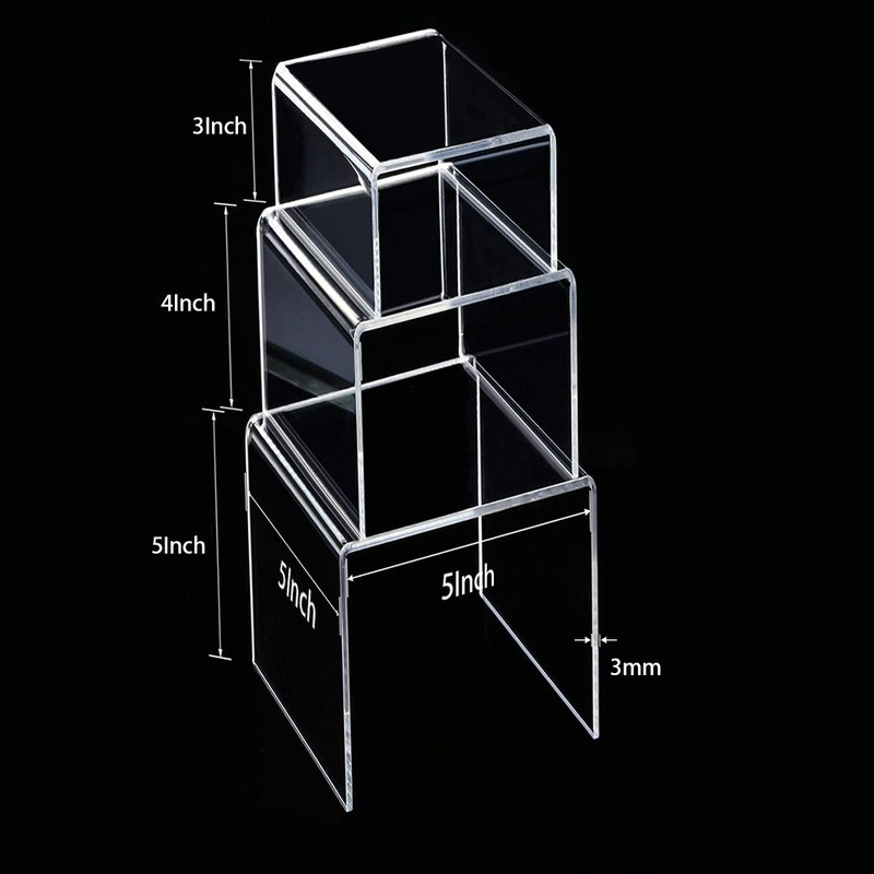 - Package includes: 3 square transparent acrylic display risers, each display riser in 3 different sizes.