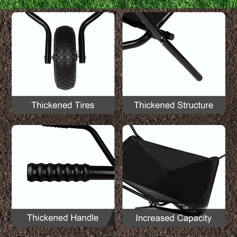 - STABLE WHEELED WHEELBARROW: This foldable portable wheelbarrow has a 13in pneumatic tire with an anti skid pattern, which is reliable and suitable for most types of terrain, And the tire steering control is more flexible than other cart, so you can easily maintain control and balance