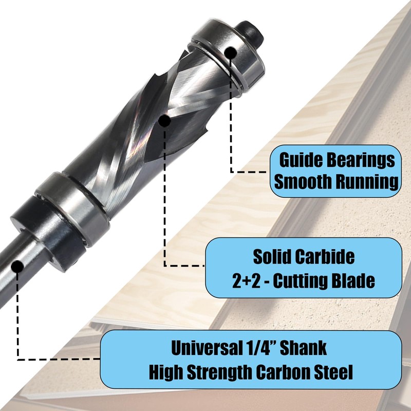 - 【High-Quality】Augbits Flush Trim Router Bit is constructed from a hard alloy cutting head and a high-strength carbon steel shaft. Featuring high hardness, excellent wear resistance, sharp cutting edges, and extended durability, this tool also incorporates precision bearings that ensure exceptional concentricity and minimal friction resistance.