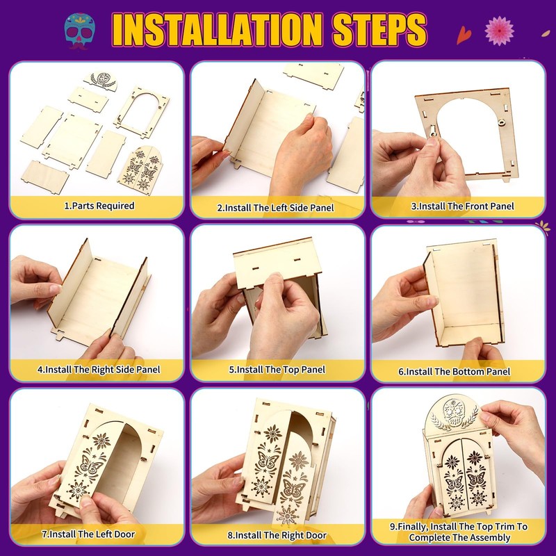 - Easy to Install: Day of The Dead ofrenda box is designed by assembling with slots. First, the side plates and bottom plates of the box body are spliced in sequence, aligned with the slots, and then two doors are installed with mini-buckles. Finally, the top skull is installed and fixed gently, so that a simple Day of The Dead ofrenda box is installed. In addition, day of the dead decor set contains installation steps, and you can choose to follow the steps of the picture for installation