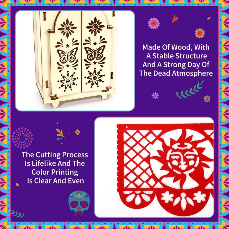 - Reliable Ofrenda Altar: Day of The Dead ofrenda box is made of reliable wood, which has been polished by many processes. compact and firm in texture, wonderful in compressionproof and deformationproof, not easy to be damaged after long-term placement, firmly supporting the decorative structure, and the surface is polished and smooth as a mirror without burrs. The banner is made of felt, which is warm when touched.Dia De Los Muertos decorations have reliable quality