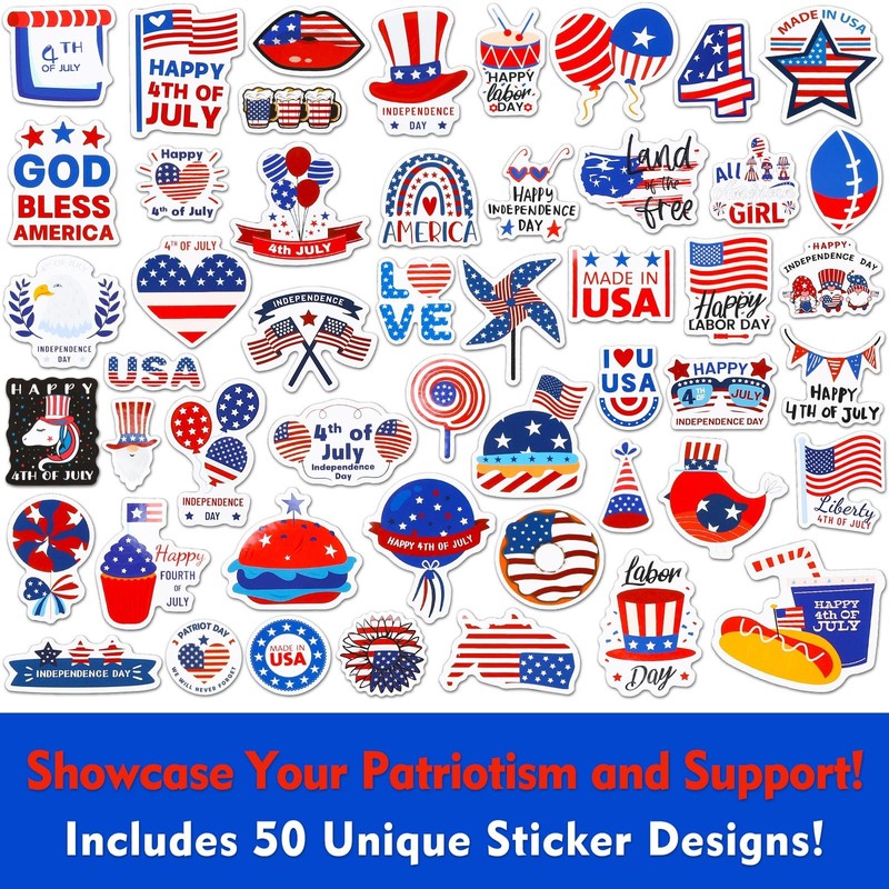- Exquisite Patriotic Stickers:50 Patriotic Stickers are made of PVC material, colorful, wear-resistant, easy to stick and without leaving traces. You can stick them on any smooth surface such as notebooks, cars, helmets, water cups, etc. to express your patriotic feelings anytime, anywhere