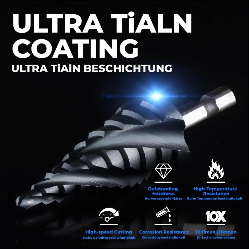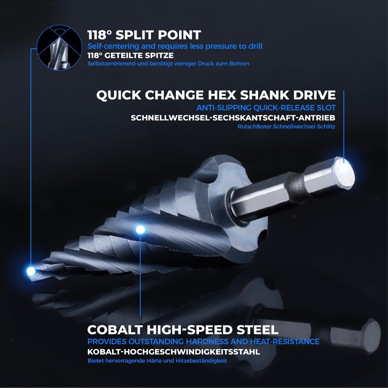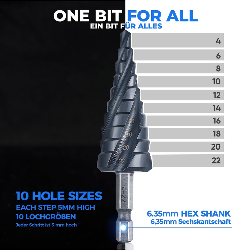 AugTouf toolant Four Spiral Flute Cobalt Step Drill Bit(Pro Max), 4-22mm Impact Ready Four Spiral Flutes Unibit Step Bit, 1/4" Hex Shank Unibit for Metal, Stainless Steel, Aluminum, Wood, Plastic