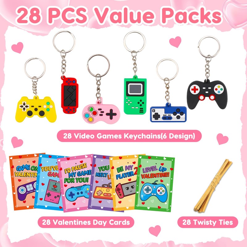 - Super Value Set for Valentine's Day: These keychains for kids valentines includes 28 video game keychains, 28 cards and 28 twisty ties. Come with 6 unique designs, each personalized valentine's greeting card perfectly matched with the corresponding keychain. Great valentines day gifts for kids school, video game party favors, valentines cards for kids classroom, valentines gifts for kids