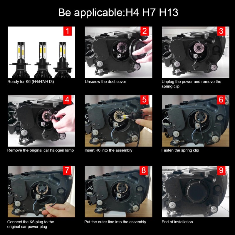 - High brightness: The latest cob with 6500K cool white LED chip; 300% brighter than the existing halogen headlights. Advanced technology ensures perfect beam patterns without any black spots.