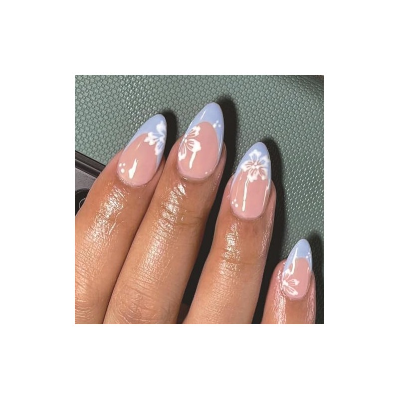 Auiremrti Pack of 24 Blue French Tips for Pressing Nails, Medium, Almond Shape, Artificial Nails with White Flower Design, Reusable Artificial Summer Nails