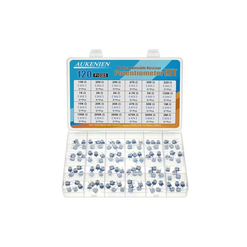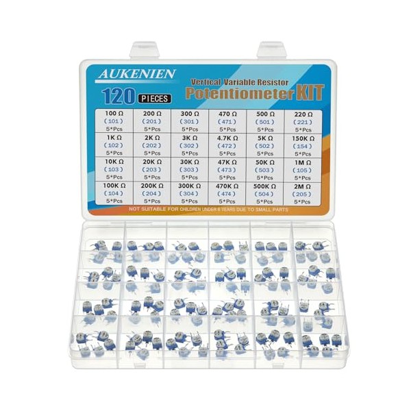 AUKENIEN AUKENIEN 24 Values 120pcs 100 200 300 470 500 220 1K 2K 3K 4.7K 5K 150K 10K 20K 30K 47K 50K 100K 200K 300K 470K 500K 1M 2M Ohm Vertical Variable Resistor Potentiometer Assortment Kit