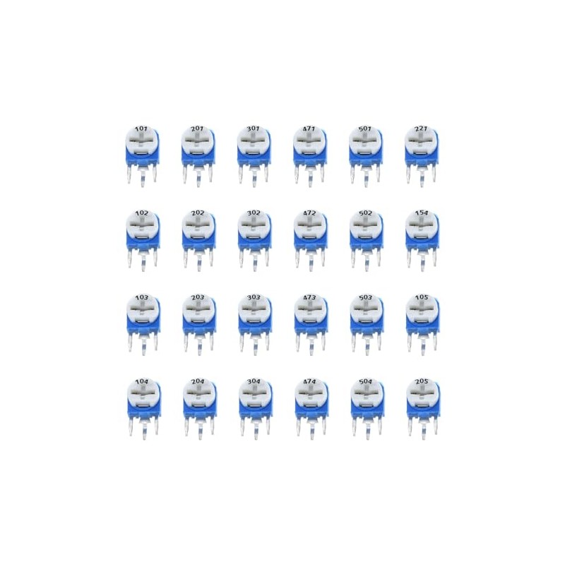 - 24 Values Variable Resistor Potentiometer Models : 100(101) , 200(201) , 220(221) , 300(301) , 470(471) , 500(501) , 1K(102) , 2K(202) , 3K(302) , 4.7K(472) , 5K(502) , 10K(103) , 20K(203) , 30K(303) , 47K(473) , 50K(503) , 100K(104) , 150K(154) , 200K(204) , 300K(304) , 470K(474) , 500K(504) , 1M(105) , 2M(205) ohm .