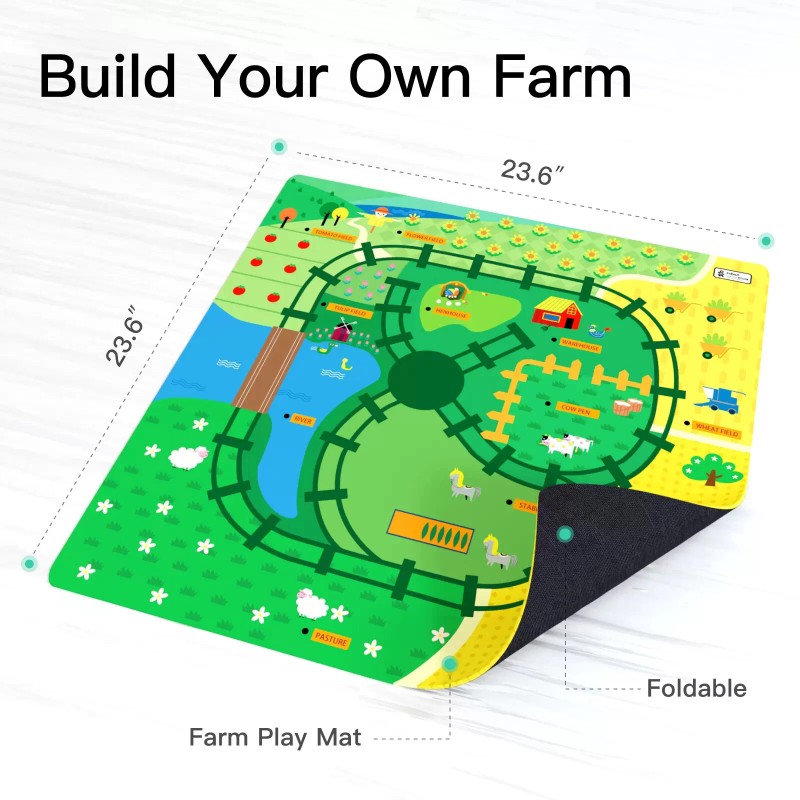 The unique mat brings a simulation scene which makes this toy train tracks set more appealing. Mat dimension: 23.6inch x 23.6inch. Soft mat lowered noise when kids play tracks. It is a farm-themed mat for kids.