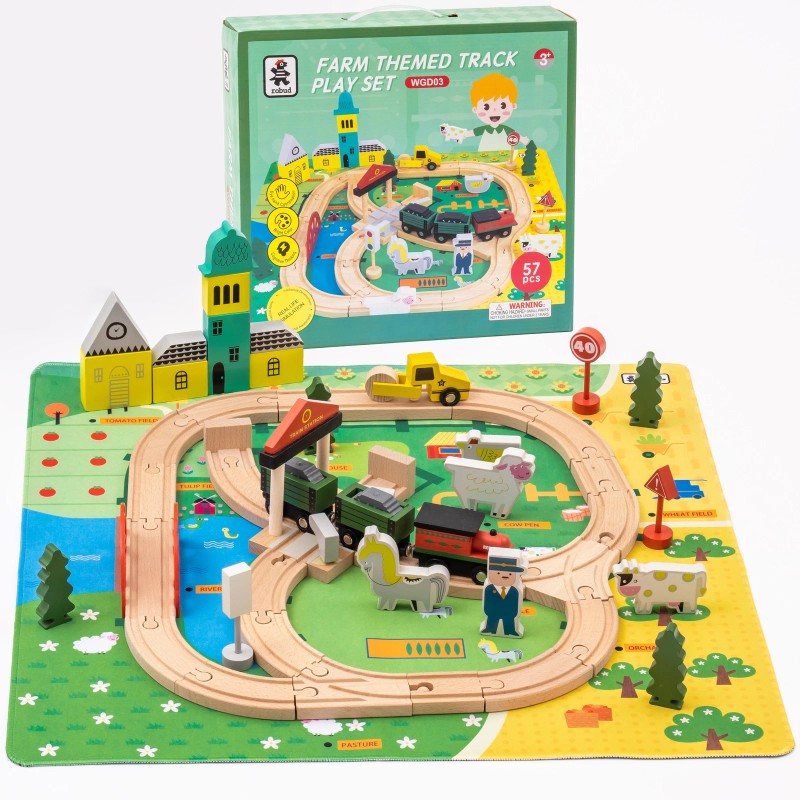 The toy train set comes with 57pcs accessories. Including magnetic trains, train stations, cars, people, trees, house blocks, traffic signs, animals such as sheep, cows, horses, chickens, tracks, and mats.