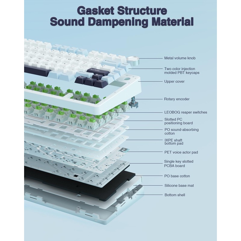 - Gasket Structure & PCB Single Key Slotting: This thocky heavy mechanical keyboard features a gasket structure, extended integrated silicone pad, and PCB single key slotting, better optimizes resilience and stability, making the hand feel softer and more elastic. Five layers of filling silencer fills the gap between the PCB, the positioning plate and the shaft,effectively counteracting the cavity noise sound of the shaft hitting the positioning plate, and providing a solid feel