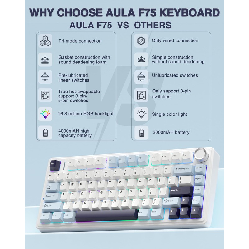 - Tri-mode Connection Keyboard: AULA F75 wireless mechanical keyboard supports BT5.0, 2.4GHz wireless and USB wired connection, can connect up to five devices at the same time, and easily switch by shortcut keys or side button. F75 computer keyboard is suitable for PC, laptops, tablets, mobile phones, PS, XBOX etc, to meet all the needs of users. In addition, the rechargeable keyboard is equipped with a 4000mAh large-capacity battery, which has long-lasting battery life