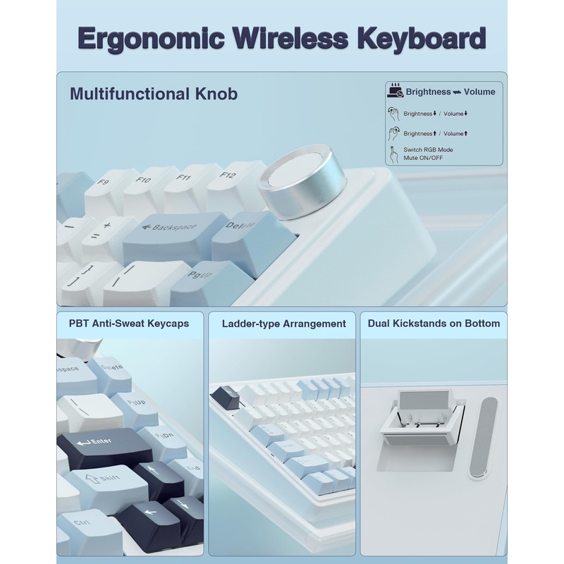 - Multi-function Control Knob: This AULA 75% wireless gaming keyboard is equipped with functional knob to switch gaming mode or office mode. In gaming mode, you can rotate the knob to adjust the brightness of the lights, and click the knob to switch the lighting effects easily; in office mode, rotate the knob to adjust the volume, and click the knob to play or pause. Long press the knob for about 5 seconds to switch modes