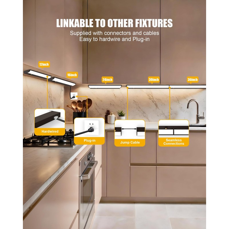 • Versatile Application: The newly upgraded cabinet lights are available in 5 sizes (12/16/24/30/36 inches) and 3 colors (black/white/brown), allowing them to seamlessly blend with cabinets of any hue. They are suitable for a variety of settings including kitchens, cabinets, countertops, offices, closets, bookshelves, stairs, basements, shelves and closets. These lights not only create a bright and inviting atmosphere but also significantly enhance overall lighting quality