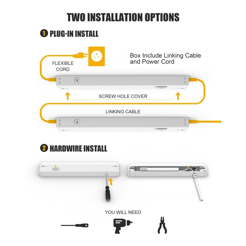 • Easy to Install: Our under cabinet lights are designed for quick and hassle-free installation, requiring only a few simple steps as outlined in the instructions. We provide UL-listed push-in connectors, a standard accessory kit, and power cables for your convenience. Additionally, our lights feature multiple knockouts to enhance the hardwire installation process