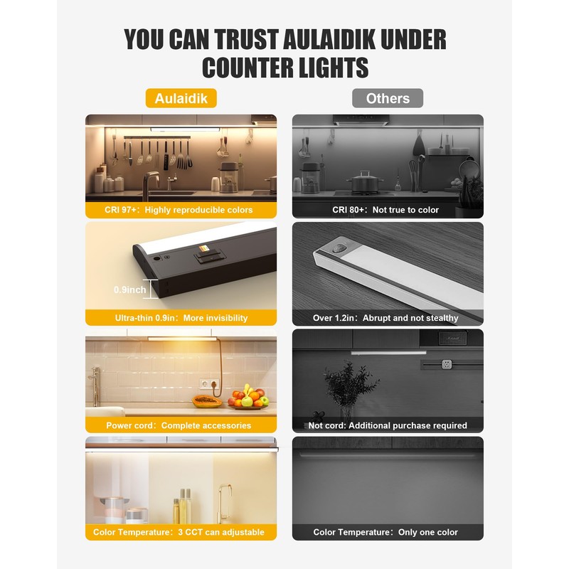 • Energy Saving LED: The direct wire under-cabinet light features energy efficient, eye friendly LEDs that deliver uniform light distribution while reducing electricity costs by up to 80%. With a Color Rendering Index (CRI) of up to 97, our lights accurately restore the true colors of objects, ensuring a vibrant and natural illumination