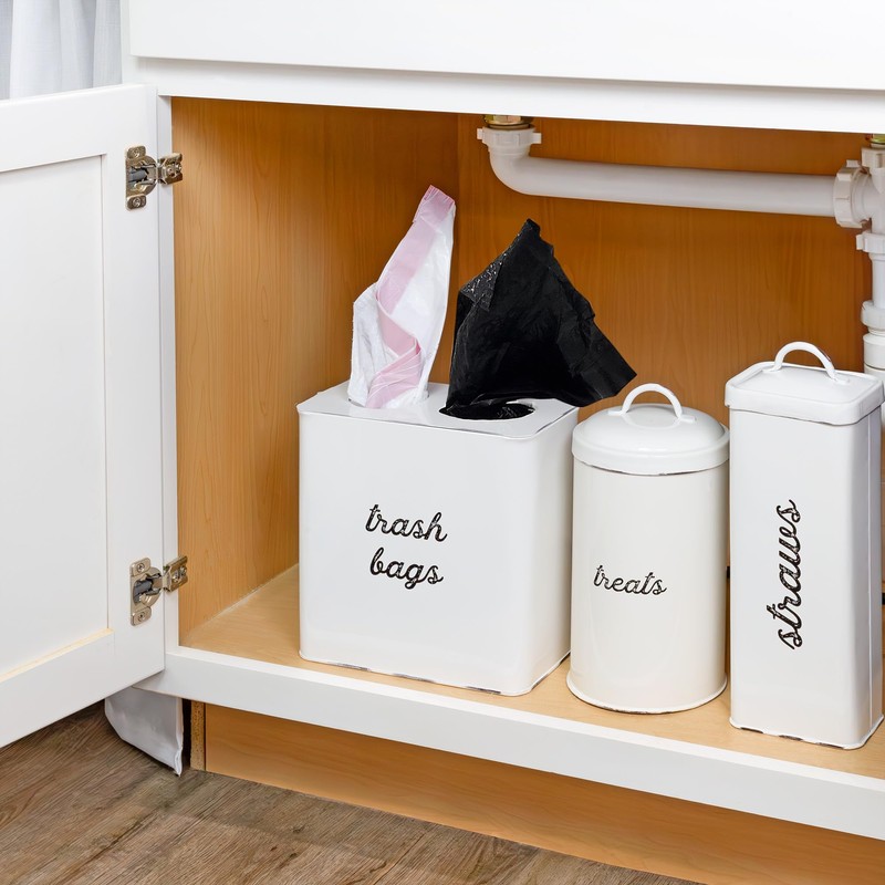 - STORAGE ACCESSORY: Decorative and discreet, stylish container for 2 sizes of plastic garbage bags, can be used under cabinet, countertop or wall mounted