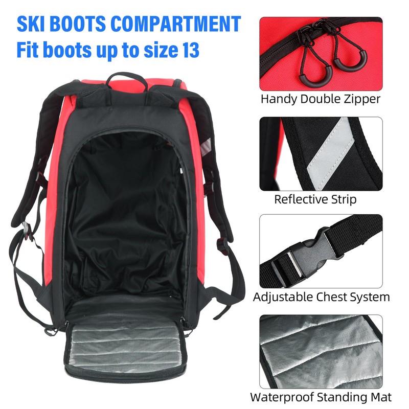 - Comfort Features : The soft grab handle on ski bag backpack offer extra carrying choices; Comfortable and adjustable shoulder strap with a reflective strip to protect you safety at night. Ergonomic design of back panel improve your comfort