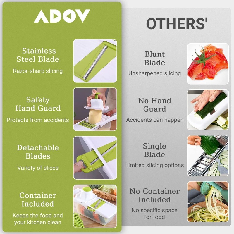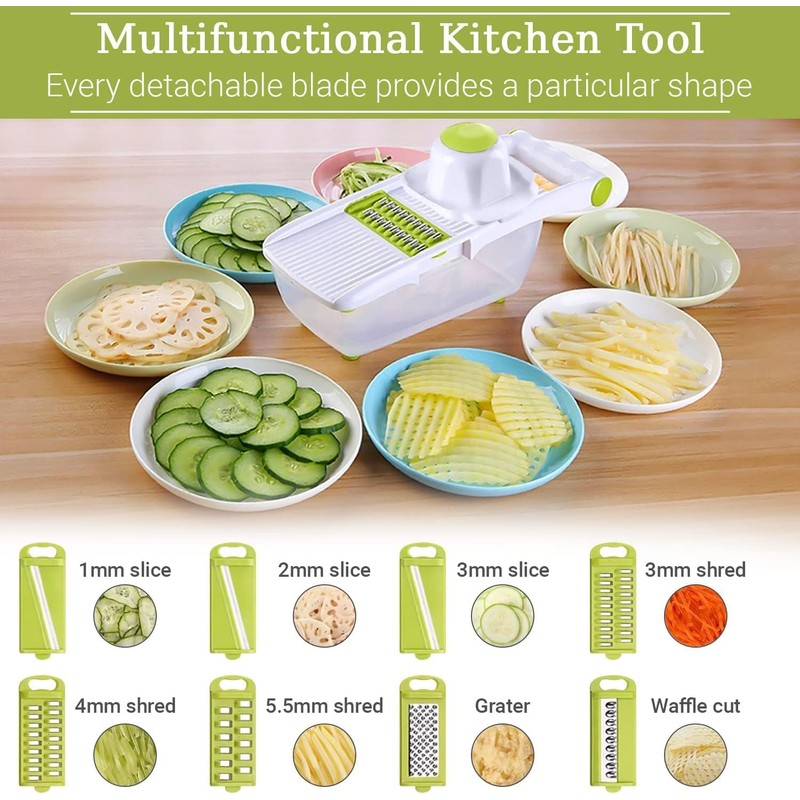 - 【ALL-IN-ONE KITCHEN TOOL】With 8 stainless steel blades, a slicing panel, food container, and finger guard, this vegetable slicer meets all your kitchen needs, chopping, slicing, and grating vegetables and fruits quickly and efficiently.