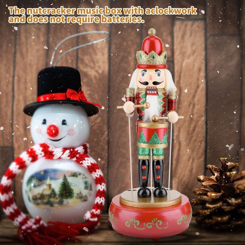 - Nutcracker music box: The nutcracker music box has a realistic soldier doll on the base. The circular base is designed to stand firmly on the table. The base uses a clockwork switch that can be operated without batteries. Turn the clockwork and the nutcracker soldier follows the music and knocks the eardrum up and down. It can play wonderful Christmas music to add a different Christmas atmosphere to your holiday.