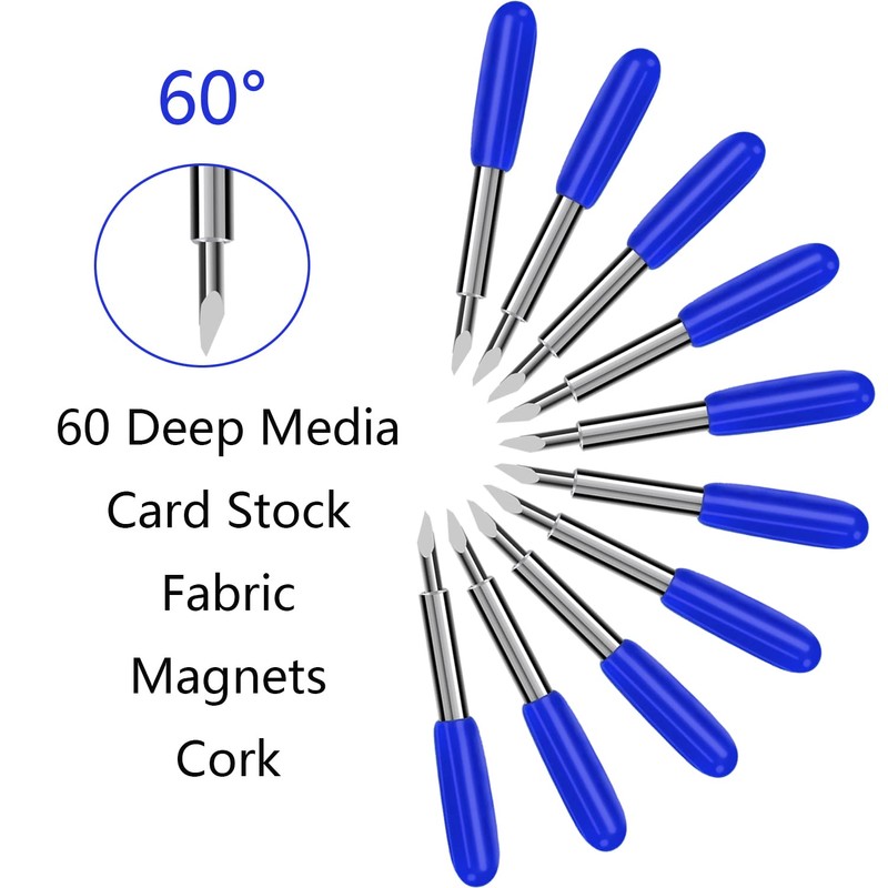 60 Degree Deep Cut Blade: used for cutting magnet, chipboard, stamp material, thick card stock, foam sheets, cardboard, and some fabrics. (Please used them with the deep-point blade housing.)