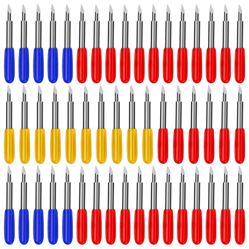 - ★【50 PCS Replacement Blades 】- These cutting blades are compatible with Explore Air/Air 2 /Air 3/Maker/Maker 3/ Expression Cutting Machines. There are 50 pcs blades replacement including 30 pcs 45 Degree Standard Blades (Red Cap)+ 10pcs 60 Degree Deep Cut Blades (Blue Cap)+10pcs 30 Degree Blades (Yellow Cap).