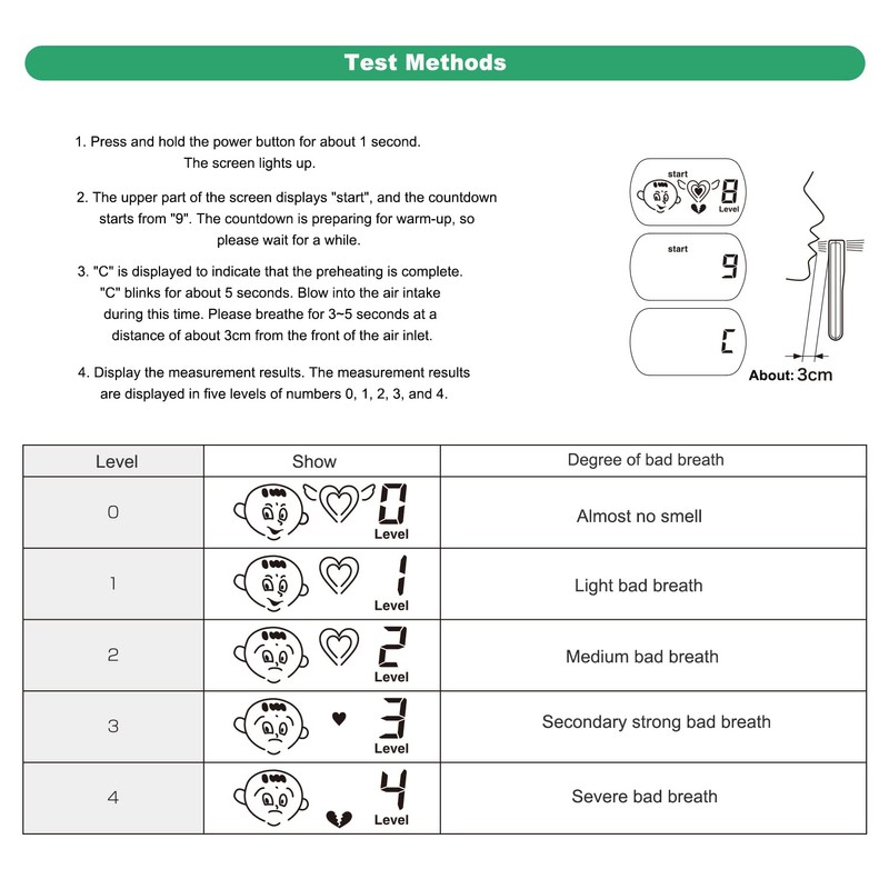 - . This bad breath detector features a digital LCD screen and a backlight cartoon display. Test results will be shown in both digital and cartoon forms. When using the breath odor tester, it provides accurate results ranging from 0 to 4 based on your oral condition.
