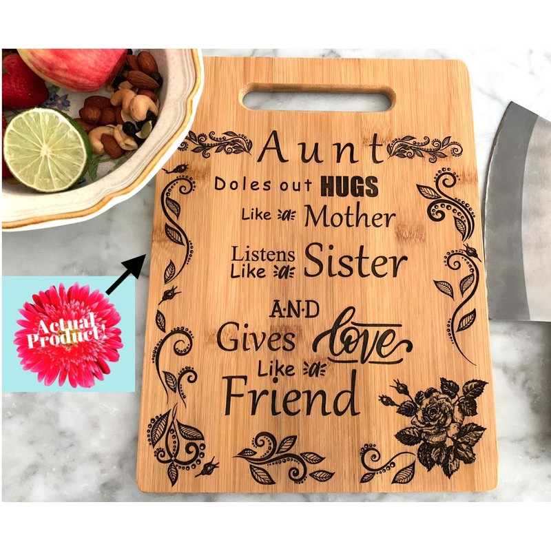 • Show Aunt your love by giving her this beautifully custom engraved all natural, organic bamboo cutting board.