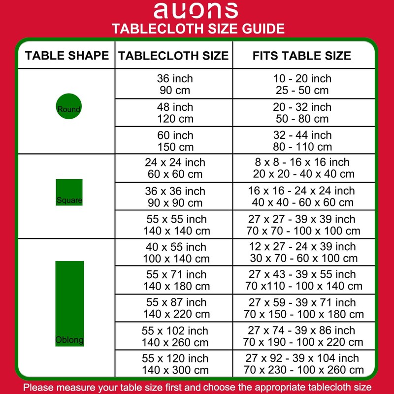 - SIZE GUIDE: Please refer to the formula: The table size+ desired drop x 2 = tablecloth size. For a better appearance, it is recommended to have overhangs of 8 to 14 inches (20-35 cm) on each side of the table.