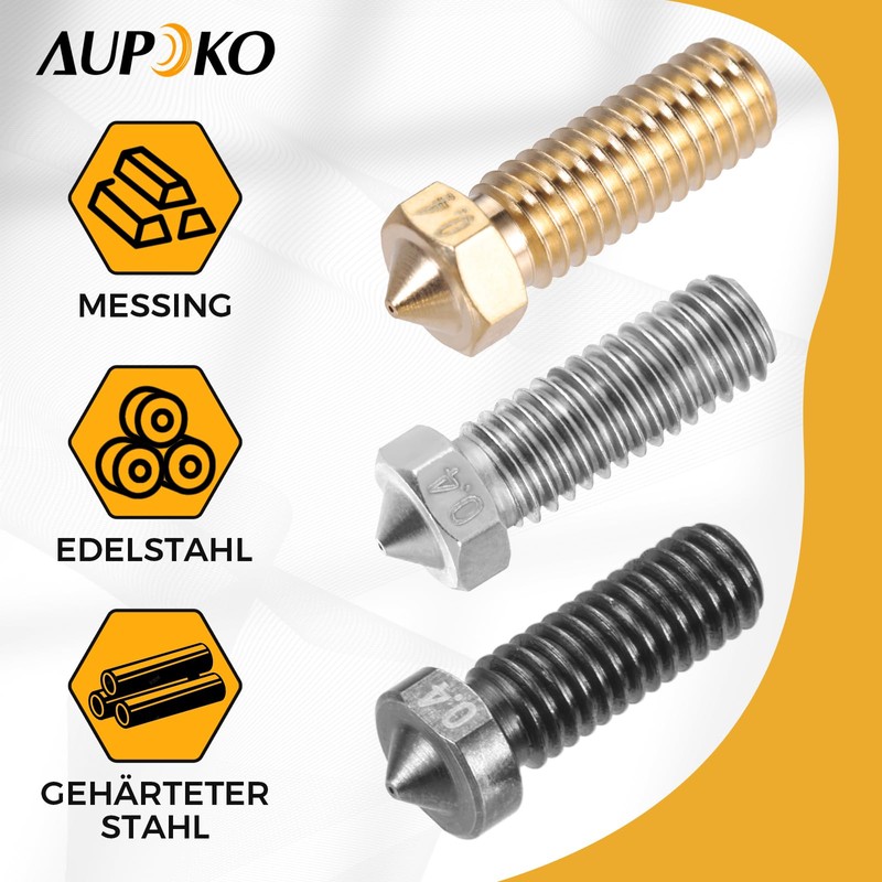 - Package: 5 pieces hardened steel + 5 pieces stainless steel + 5 pieces brass high temperature nozzles. This kit contains a total of 15 pieces 0.4 mm nozzles in three materials. The exquisite workmanship makes the parts durable.