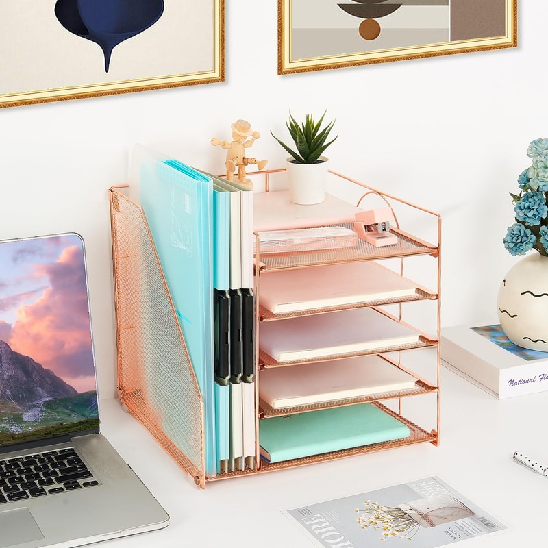 AUPSEN Desk Organizer with File Holder, 5 Trays Paper Letter Tray Organizer, Mesh Desk Organizers and Accessoriesand for Home Office (Rose Gold)