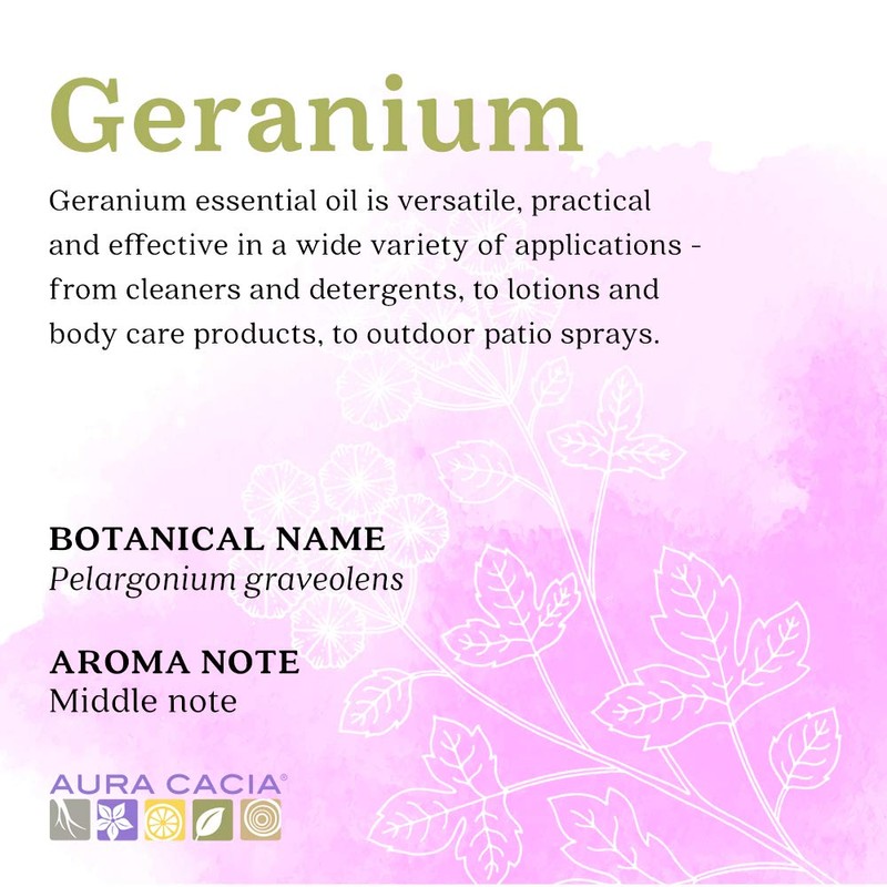 - ORIGIN AND SOURCING - Aura Cacia Geranium Essential Oil comes from Egypt. It is obtained by steam distillation of the leaves and flowering branches.