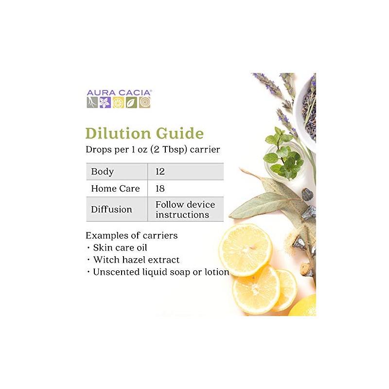**SUGGESTED USES** Quick Tip: Blend 12 drops with 1 fluid ounce Aura Cacia Macadamia Oil for a body oil. Recipe: Geranium Mist Ingredients 24 drops Aura Cacia Geranium Essential Oil 1 teaspoon Aura Cacia Fractionated Coconut Oil 2 fluid ounces water 2-ounce Aura Cacia Amber Glass Mist Bottle Directions: In bottle, combine oils and water. Shake until well blended then mist airspace, avoiding face. **DIRECTIONS** There are so many ways to use essential oils! The above suggested uses are just an introduction to a wide variety of quick tips and recipes available from Aura Cacia. Because essential oils are highly concentrated, we recommend diluting them in a carrier product like skin care oil, unscented lotion, or unscented liquid soap. Follow this guide for safe, effective use. **DILUTION GUIDE** Drops per 1 oz (2 Tbsp) carrier Body - 12 Home Care -18 Diffusion - Follow device instructions