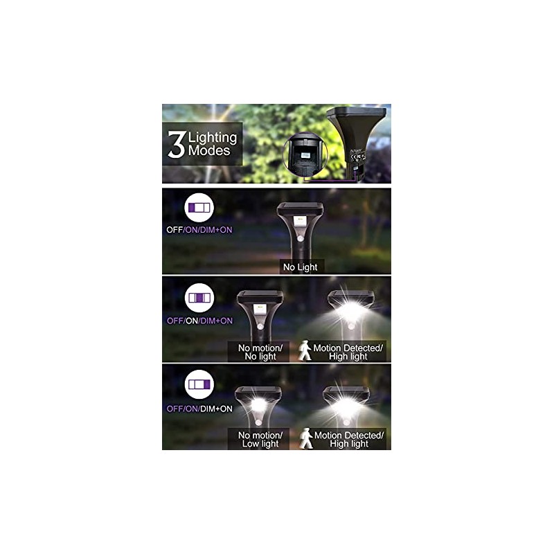 - 【Multi Lighting Mode】AURAXY solar motion sensor lawn light has two modes of "ON" or "DIM+ON" for you to choose.Auraxy solar landscape spotlights Integrated light mostion sensor, can easily absorb the sunlight during the day and automatically turn on the lights at dusk to achieve worry-free lighting.