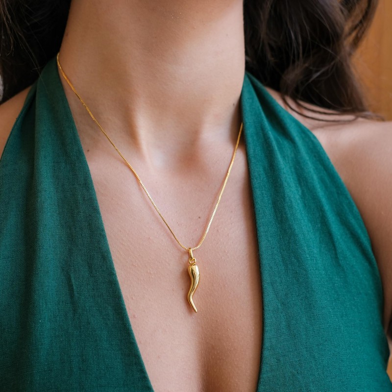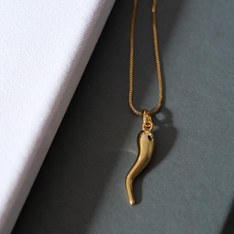 - Introducing our large cornicello Italian horn pepper necklace, a perfect good luck charm for both men and women. This unisex jewelry piece features a large pendant that is sure to make a statement. This traditional Italian Cornicello symbolizes good luck and protection. Worn for centuries, it is believed to ward off the evil eye and provide prosperity. Let this timeless charm bring fortune and blessings to you.