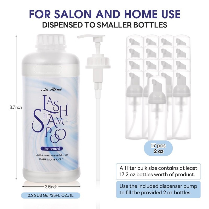 • What You Get About Lash Extension Shampoo - The set includes a 1 liter bottle of lash shampoo, 1 pump dispenser, 2 Foam Pump Bottles, and 1 lash cleansing brushes.