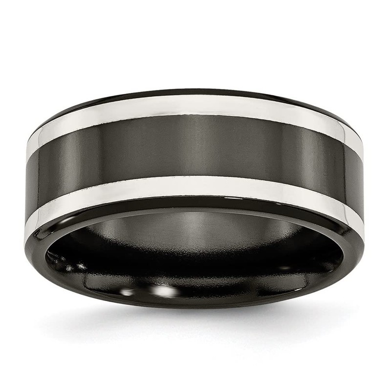 - PRODUCT SPECIFICATIONS : Black Titanium with Sterling Silver 9mm Inlay Polished Flat Band Size 9, Finish:Polished|Material: Accent Color 1:Yellow|Band Width:9 mm|Material:Titanium/Silver Two-Tone|Ring Fit:Standard|Sizeable:No|Thickness:< 2 mm|Product Type:Jewelry|Jewelry Type:Rings|Sold By Unit:Each|Gender:Unisex|Material: Inlay:Sterling Silver|Material Color:White|Ring Type:Wedding Bands