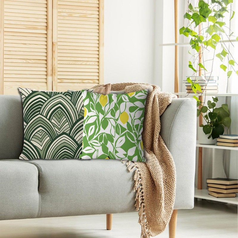 2: The cushion covers feature a modern vegetative leaf and botanical floral pattern in green.