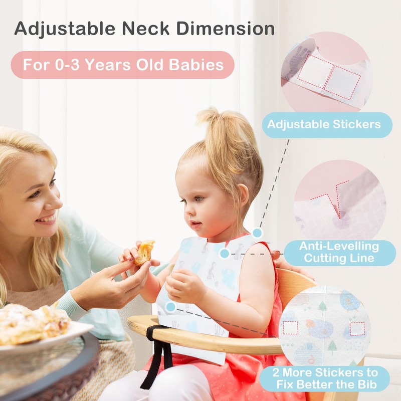 - Adjustable collar: thanks to the adjustable neck circumference and optimal positioning on the chest, parents can easily put on and take off the bib. The disposable bib is equipped with adhesive strips on the back that hold it securely in place.